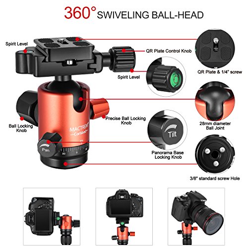 Título: Trípode Camara Mactrem CT62 Carlsbad 62,5" Ligero de Aluminio, Desmontable Monopod, Cabeza de 360 Ball, Quick Release Plate & Carry Case para Cámaras DSLR Video Digital - 33lbs MAX Load (Naranja)